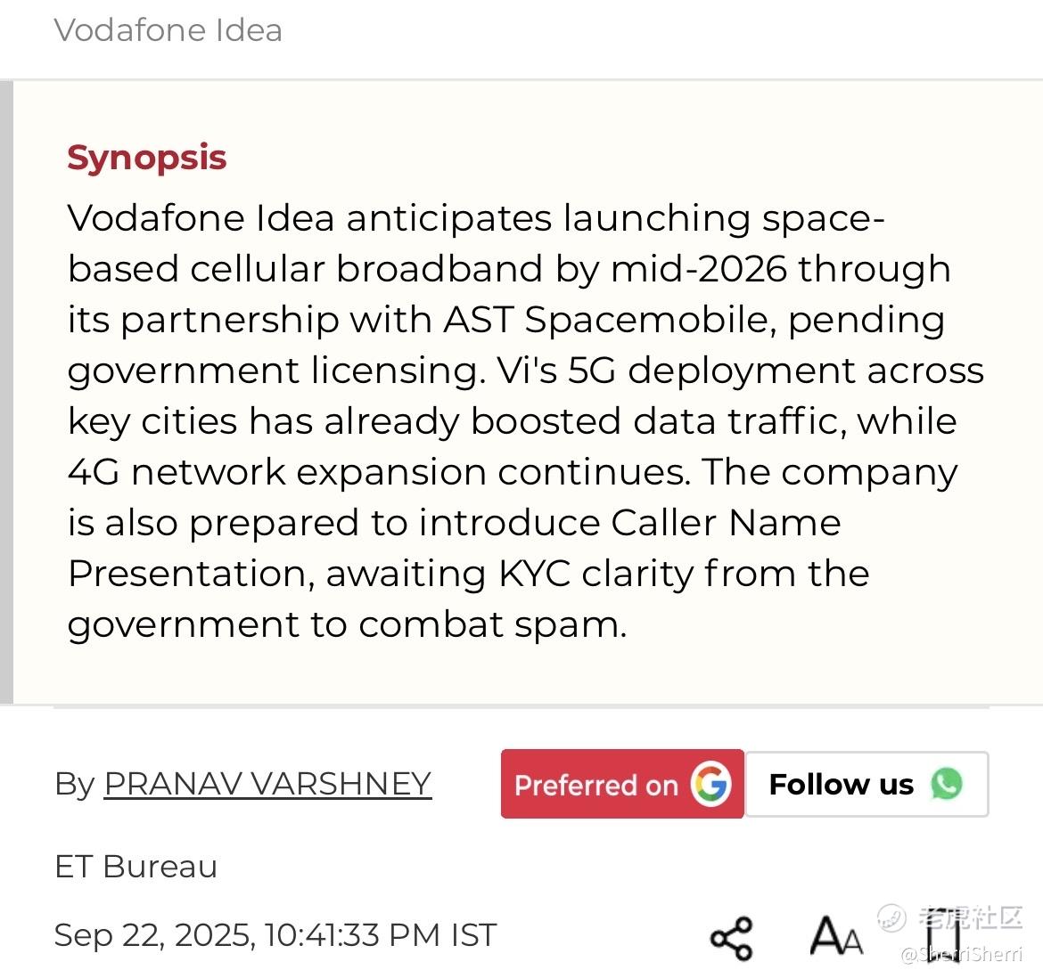 最新:沃达丰创意(印度)计划通过与$AST SpaceMobile(ASTS)$ 的合作,在2026年年中推出基于太空的蜂窝宽带服务。
