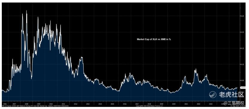 图:美股科技ETF(XLK)的市值v.s.美股金属矿业ETF(XME)的市值