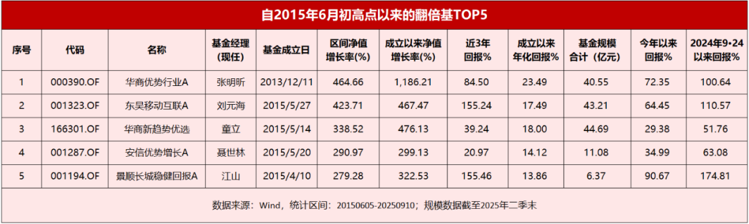 我们以2015年6月5日为起点,截至2025年9月10日,筛选出全市场净值增长率排名Top50的绩优基金榜单。结果显示,这些基金不仅全部实现十年累计收益翻倍,更有22只实现两倍以上增长,17只年化收益率超过15%。即便在近年结构性震荡的市场中,仍有不少基金自去年“9·24”以来再度实现净值翻番。