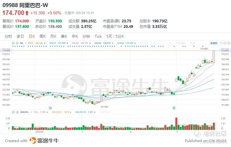 另一边是国内互联网AI龙头的阿里,过去两周先是自研芯片的拔估值,再到今天阿里在宣布在3800亿的capex上再加码,直到2032年阿里云全球数据中心的能耗规模将提升10倍,大家预计平均下来每年投入约1500亿元,也就对得上市场传言的1万亿capex传闻,反映到股价上就是阿里再创年内新高,今天大涨9%。