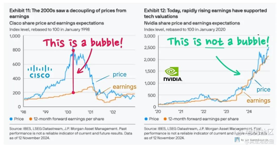 通常大家还会类比2000年的互联网泡沫,实际上这都老生常谈了,股价/EPS/资本开支,这三个都是跟得上的,没有一个会偏离很多,例如我投资下去赚不到钱,然后盈利还没提升,至少现在还没看到。甚至乎,现在NVDA对应明年的一致预期EPS才23倍PE左右,那去哪找这样的高确定性,估值还算的过来的公司呢?