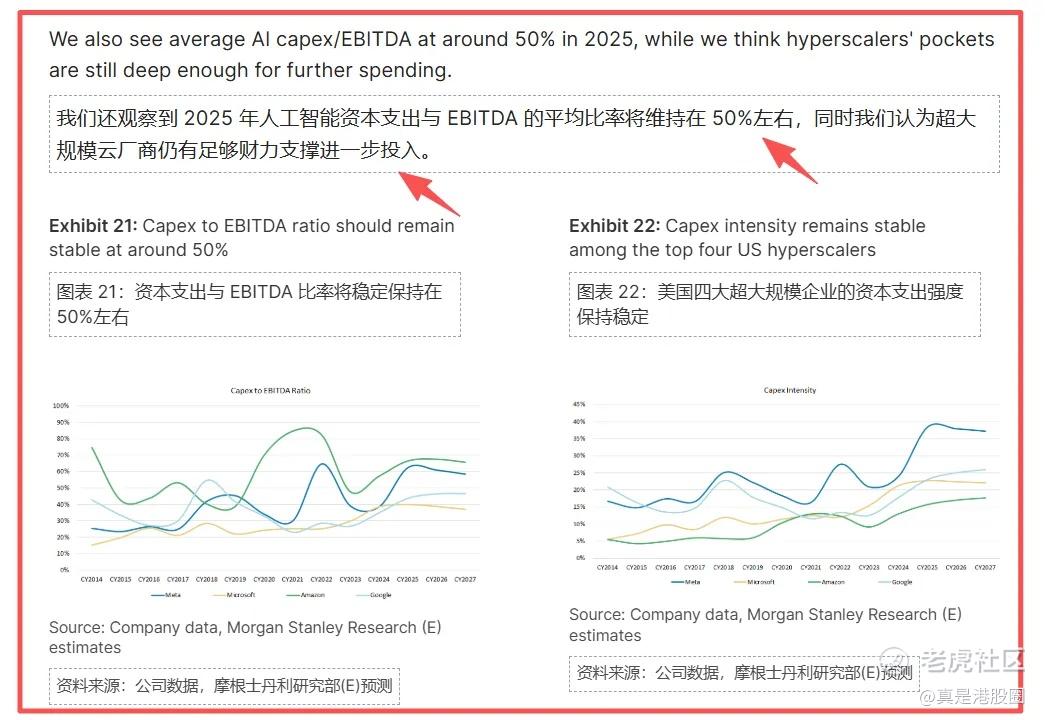 但当然,大家担心泡沫也不无道理,因为过去2年的科技公司capex,都只是自己每年利润的部分,还没有动用到举债投资,举债买AI硬件去建设赌未来。从下图中看,2025年AI capex/EBITDA的平均比率维持在50%左右,也就是说科技公司一年投入的钱只是自己利润的一半左右,还有更高的提升空间,加上大多数科技公司账上很多钱,之前拿来回购,现在拿来投资找增长,继续提高投资也很合理。