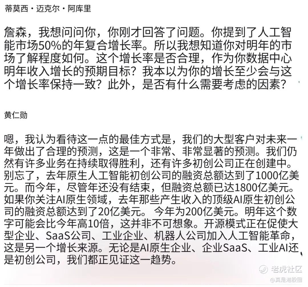 黄仁勋称,未来每年市场规模增长50%,第一个增长动力是大型的CSP客户对未来做出的合理预测;另一个增长点是开源模型正在促使大型企业、SaaS、工业企业、机器人公司都加入到AI的革命中。