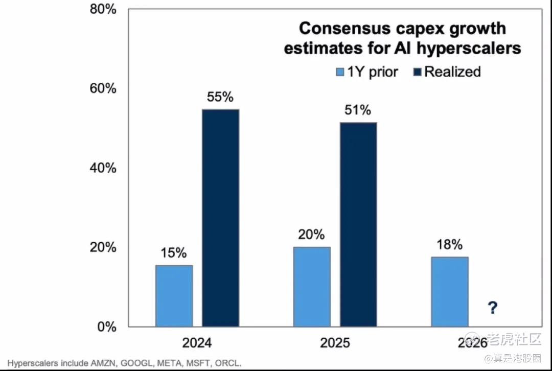 而在之前,市场预计明年的capex增速也就18%,2024年和2025年的capex实际支出是远超出市场预计的,这就说明市场投资者与科技公司的预期是有很大偏差的,AI的实际发展是远远超出所有人的预期。