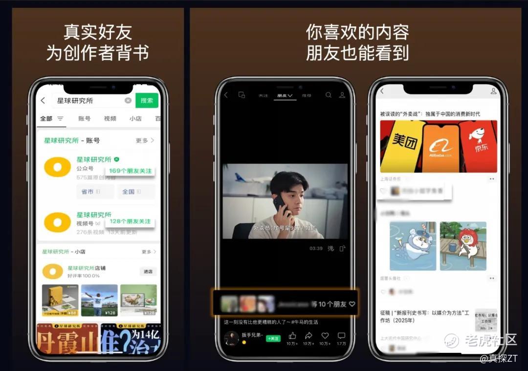 一方面,这里和其他平台都不同,这里不纯粹靠算法和买量,而是依赖社交关系。比如视频号里,你看不到一个创作者的粉丝量到底是多少,但能看到你有多少朋友关注了他。你的点赞和转发会被所有朋友看到,所以也会更谨慎,获得转评赞的内容也更有分量。