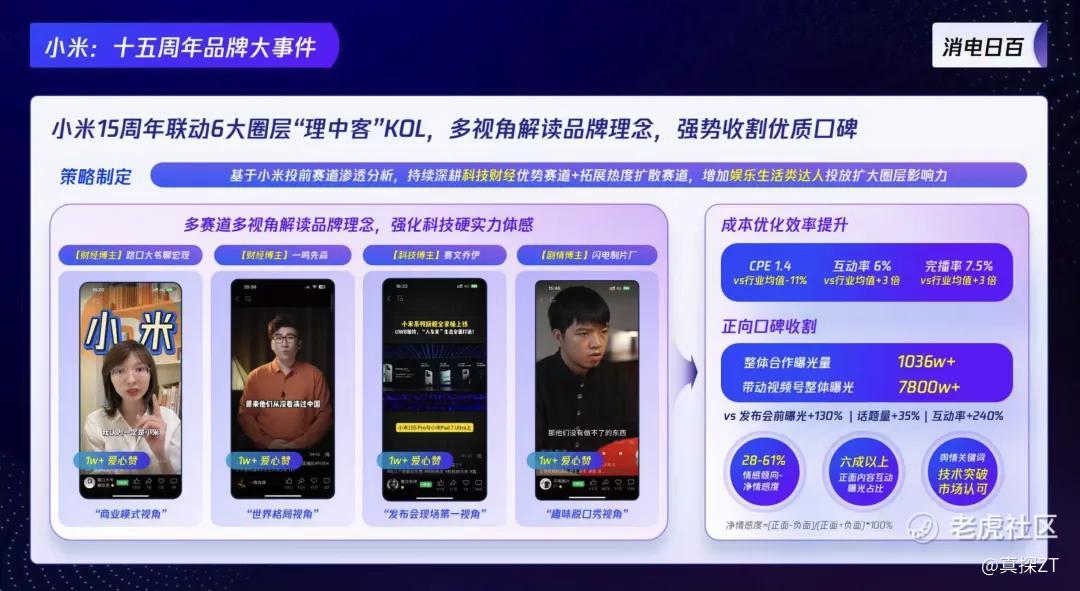 这也为品牌提供了一个重要启示:重大节点事件若能巧妙借力社交传播,往往能突破原有圈层限制,实现更广泛的触达。比如小米十五周年原本是互联网、科技行业才会关注的大事件,但品牌策略性地联动了六大圈层创作者,从商业解读、现场直击到趣味脱口秀,多角度切入,最终合作曝光超1000万,视频号相关曝光达7800万,真正实现了跨圈层的正向传播。