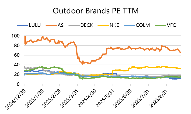 从PE的角度看,当前$亚玛芬体育(AS)$的估值更是高于同行业其他公司,如$lululemon athletica(LULU)$$耐克(NKE)$$威富集团(VFC)$$Deckers Outdoor Corporation(DECK)$$哥伦比亚户外(COLM)$等