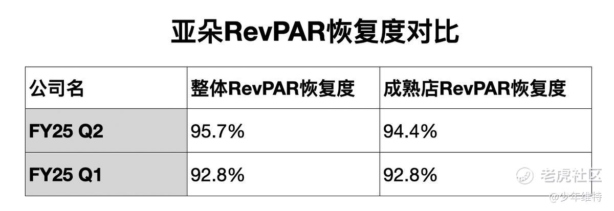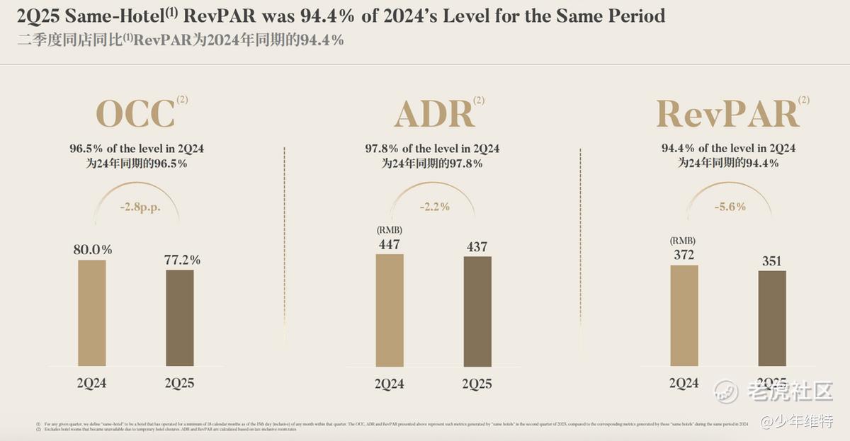 再来看成熟店,亚朵Q2成熟店RevPAR351元、ADR437元、OCC77.2%,RevPAR同比略降(-5.6%),但好过行业平均(全国RevPAR跌近10%)。