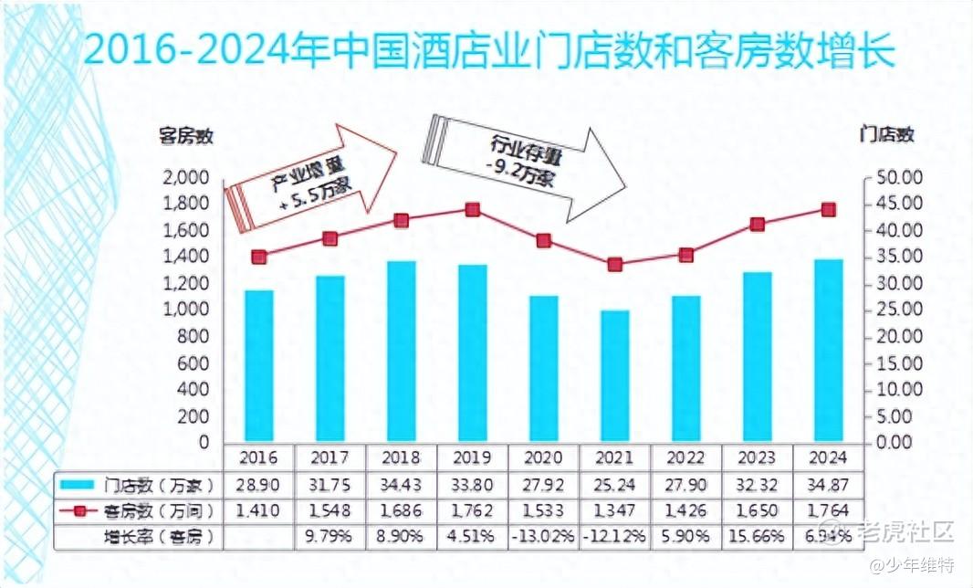 从供给侧来看,酒店开店扩张势头极猛。2021年全国酒店约25.24万家,1347万间客房;到2024年底,已经涨到34.87万家、1764万间客房——3年净增近10万家!(数据来自中国饭店协会)