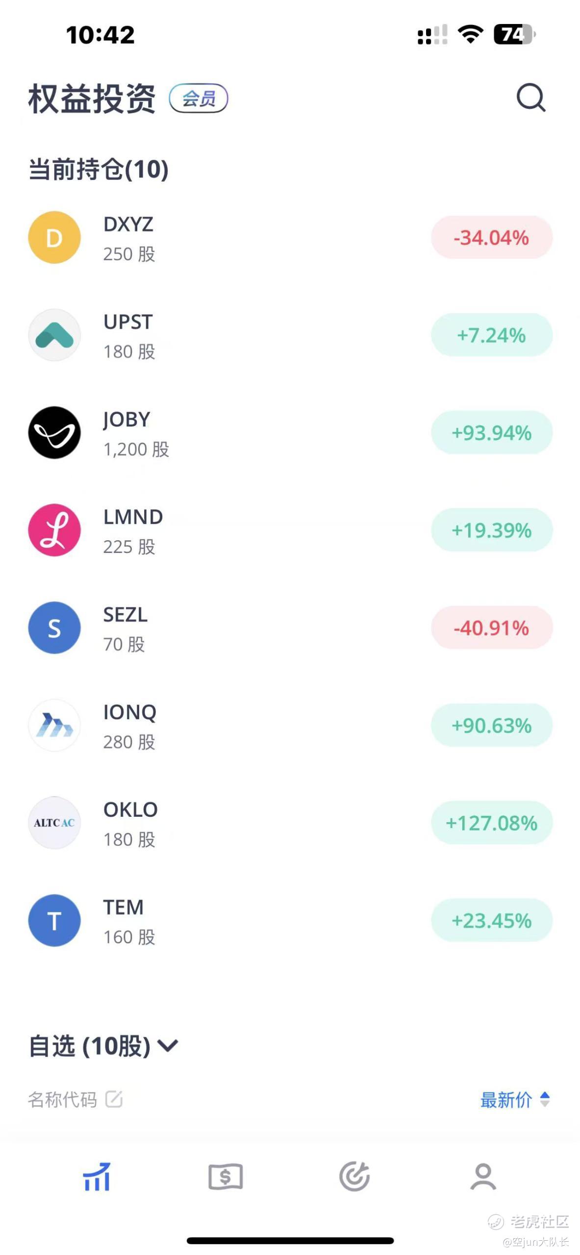 长线股的话都在回调了,而没有怎么涨的DXYZ跟SEZL反而没有跌,股票就是这样,涨得多跌得快,涨得少就跌得少,短期就是这样,长线还是要看公司基本面,OKLO跌到100左右抄底,IONQ跌到55抄底,JOBY跌到14就抄底,LUNR跌到9美元抄底,TEM跌到70可以抄底,LMND跌到50抄底,DNA,DXYZ,SEZL,UPST,都可以抄底了,长线股以前买了的人还是不要卖了,不然把涨的卖了,跌的拿着,那也不好,很可能涨的股票会继续涨,而跌的股票不一定会涨的,长线股最终的目的就是十个股票都有,这样不管哪个股票大涨都一样,十个股票里面总能压一个十倍百倍股的。