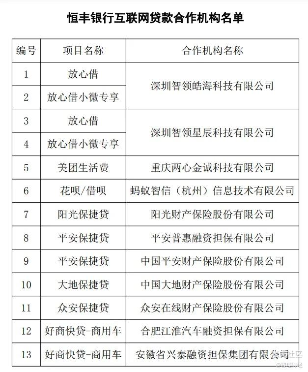 恒丰银行既列出合作机构还标明了对应产品,此外,还与江淮汽车融担、兴泰融担合作的好商快贷。