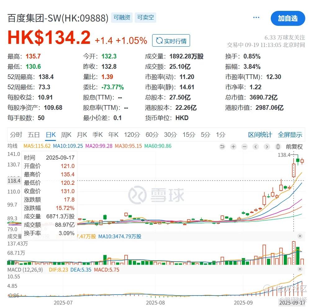 正因如此,百度在9月17日暴涨16%,总市值逼近4000亿港元。年初至今,百度港股股价累计上涨超60%。