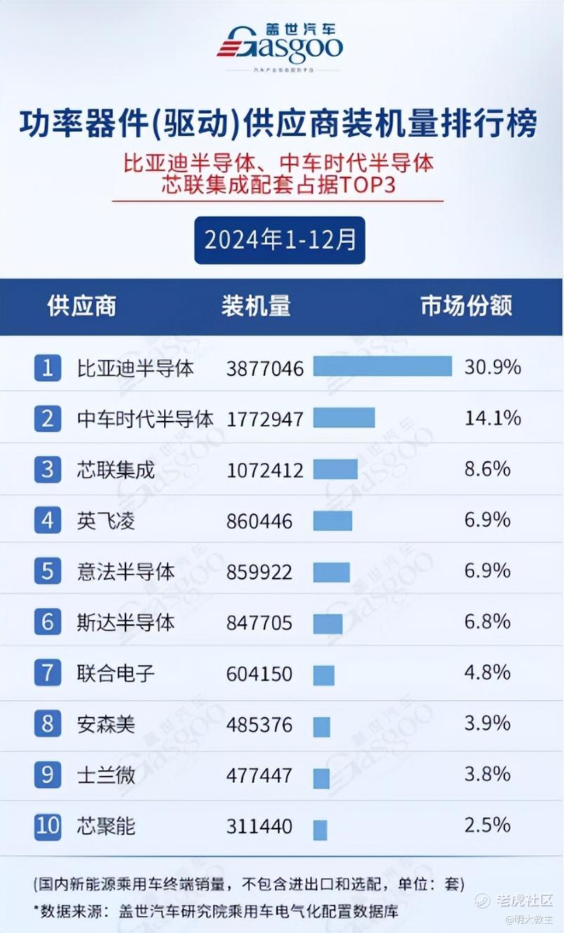盖世汽车研究院发布的《2024年功率器件(驱动)供应商装机量数据》显示,芯联集成在国内新能源乘用车功率器件装机量排行榜位居第三。