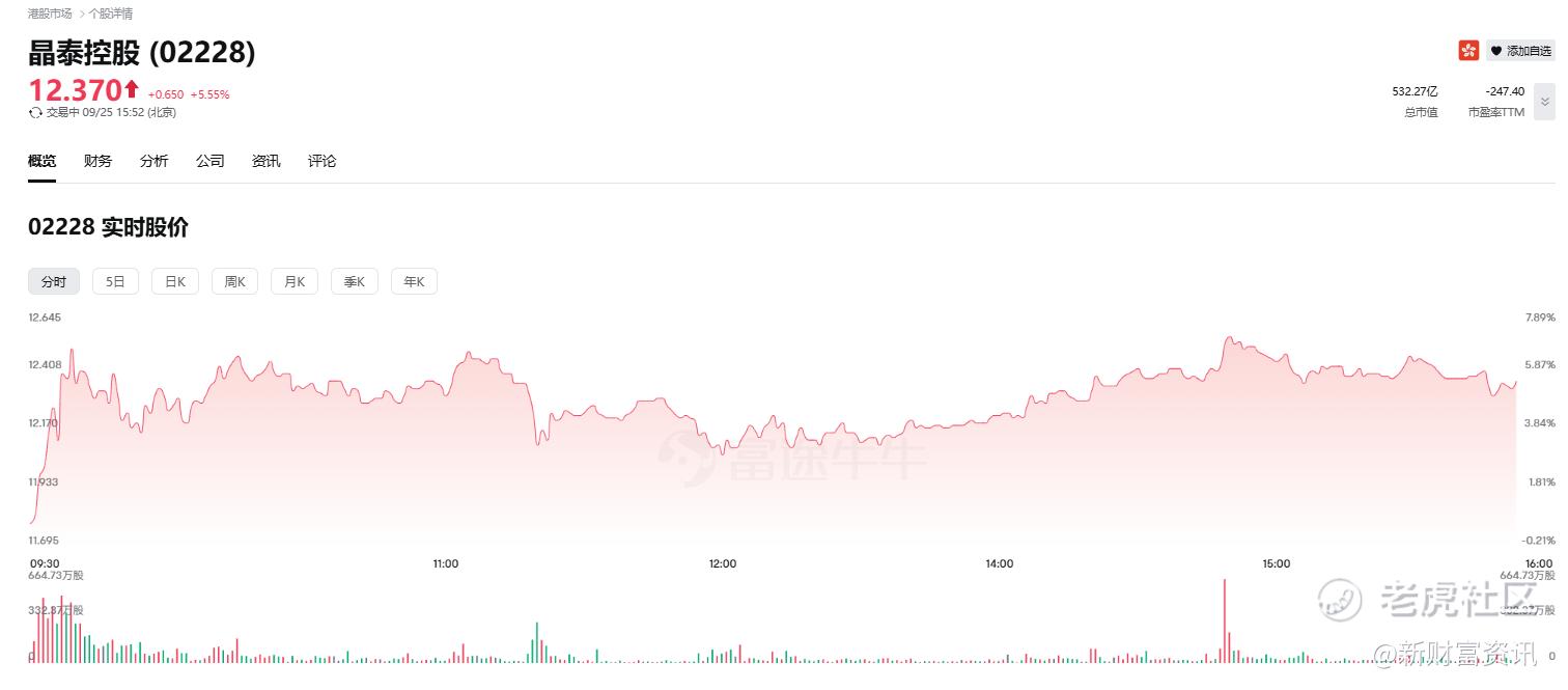 股价表现:今日(9月25日)晶泰控股股价高开高走,盘中一度上涨近7%,最高触及 12.57港元。截至发稿,股价报收于12.37港元附近,成交额显著放大。