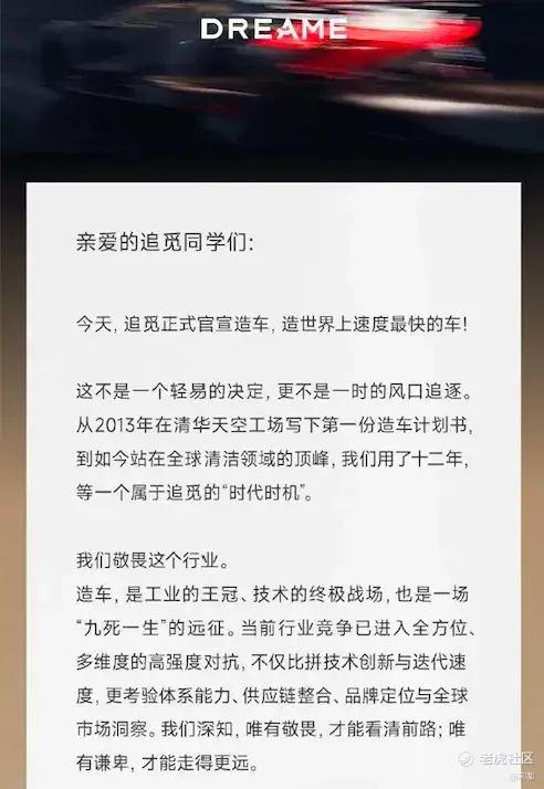在此次官宣造车中,追觅也提到其造车计划最早可以追溯至12年前。当时,创业团队评估认为,进军汽车赛道门槛太高,需200亿元的启动资金,不适合用来初次创业。但如今,追觅团队认为,时机成熟,公司可以踏入造车这个“检验自身综合能力的终极战场”。