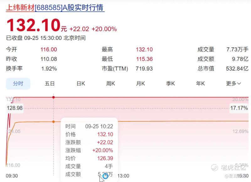 9月25日,上纬新材(688585.SH)再次涨停,收盘价报132.1元,这已是该股连续第二个交易日涨停。