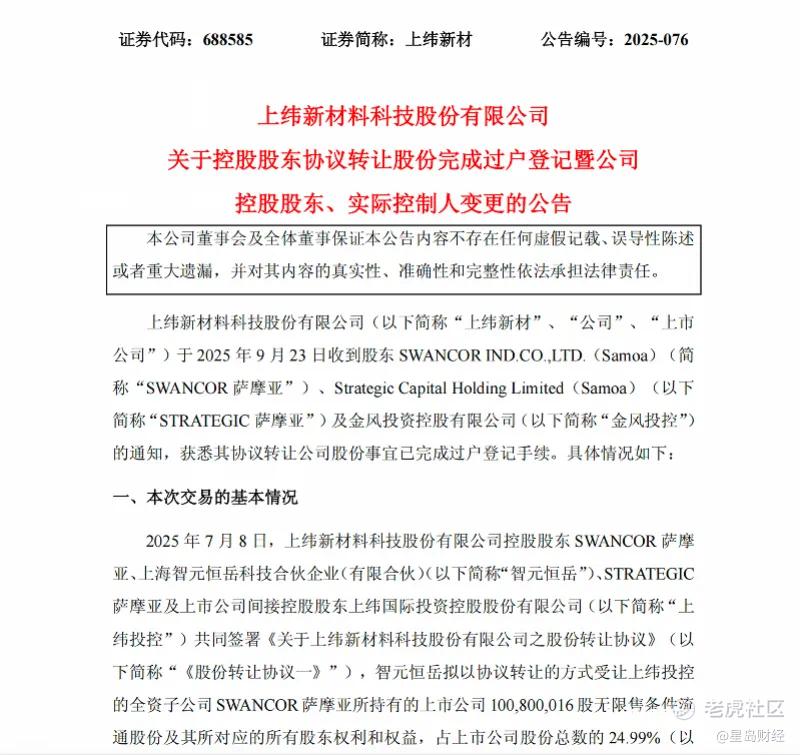第一步协议转让已于9月22日完成过户。智元恒岳受让上纬新材24.99%的股份,其一致行动人致远新创合伙受让另外5%的股权。至此,智元方面已合计持有上纬新材29.99%的股份;第二步是表决权安排。原控股股东SWANCOR萨摩亚等不可撤销地放弃其持有的约53.62%股份的表决权,为智元恒岳掌控上市公司扫清了障碍;第三步即要约收购。智元恒岳计划收购37%的股份,若顺利完成,收购方将合计持有上纬新材约66.99%的股权,超过三分之二这一绝对控制线。