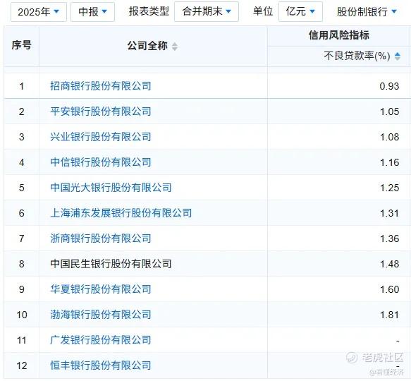 其不良贷款率1.48%,除了数据不可得的广发银行和恒丰银行,民生银行排在了第8位,仅高于华夏银行和渤海银行。