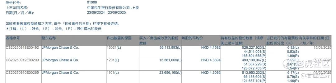 9月15日,摩根大通买入民生银行3611.4万股,每股均价4.1582港元,总金额约15016.9万港元,最新持股数为5.26亿股,最新持股占比达到了6.32%。