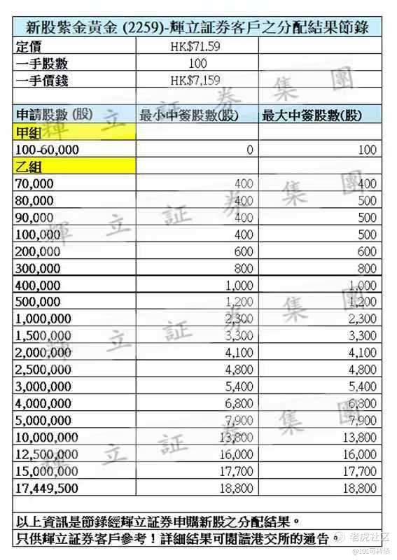 紫金黄金国际(2258)出分配结果了,甲组全员抽奖,乙头4手,此次偏向大户了,这个分配有点过分;定价:71.59,一手100股;恭喜中签的老板们!有肉吃!