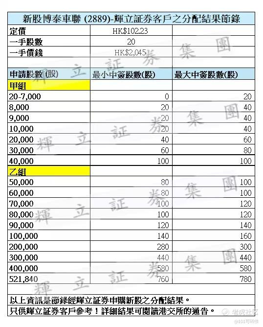 博泰车联(2889)出分配结果了,甲组400中1手,甲尾5手,乙头4-5手。定价:102.23,一手20股;恭喜中签的老板们!