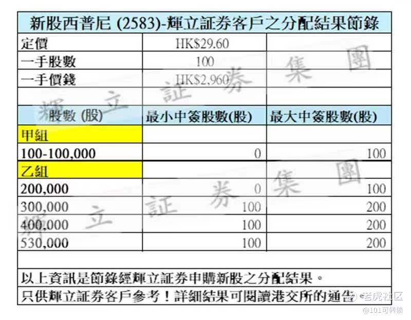西普尼(2583)出分配结果了,甲组全员抽签,乙头也抽签,顶头获配1-2手;定价:29.60,一手100股;恭喜中签的老板们!有肉吃!