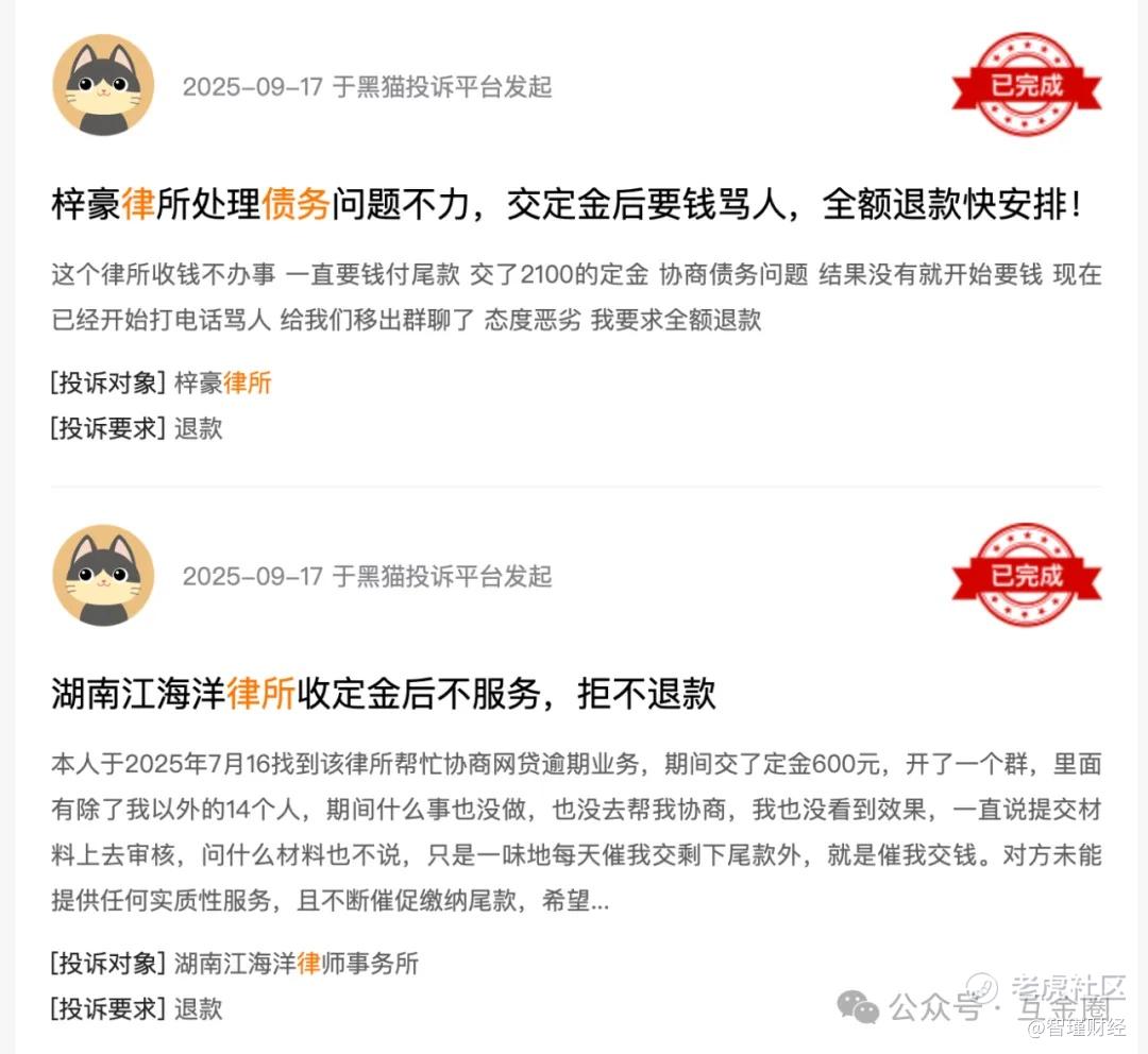 从黑猫投诉来看,不少用户都存在向律所交完定金,试图进行网贷债务协商,但却未得到实质性服务,并未真正解决其自身债务问题。