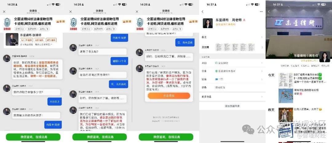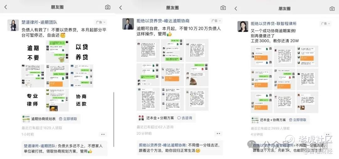 「互金圈」近日频频在公众号、朋友圈、抖音等处刷到“律所-逾期咨询”“债务协商”等广告,广告多以“成功协商逾期”“逾期可自救”等等字眼呈现,精准击中借款人急于解困的心理。