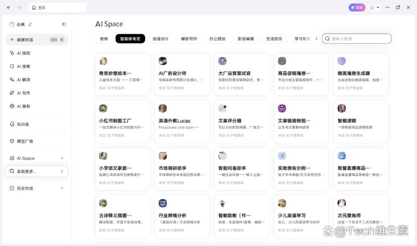 接入Coze平台后,天禧实现了成为“总服务台”的质变.用户不再需要关心某个具体功能是由哪个智能体提供的,只需在天禧的统一入口“AISpace”中选择合适的AI工具来满足需求.例如办公场景中,我们不仅可以使用已经集成在天禧中的ChatExcel整理表格,还能使用由Coze生态贡献的、更细分的办公AI,如“AI广告设计师”“精美海报生成器”等,实现按需取用.