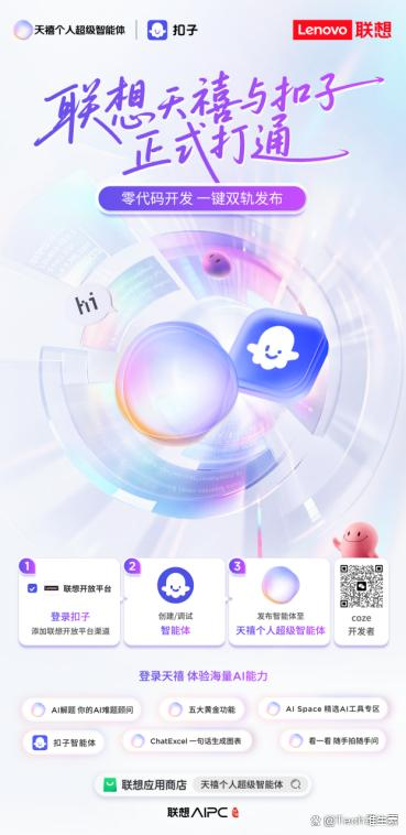 联想始终强调“AI普惠”的愿景,与Coze的合作,是这一愿景的深化和进阶.如果说内置ChatExcel是让用户率先体验到AI带来的效率革命,那么接入Coze的万千智能体,则是将AI的创造权和选择权真正交还给开发者和用户,让AI能力以前所未有的广度和深度渗透到生活的每一个毛细血管.