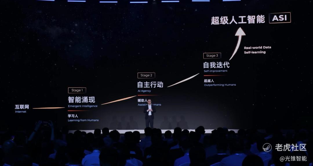 同时,吴泳铭也系统性的阐述了通往ASI的三阶段演进路线: