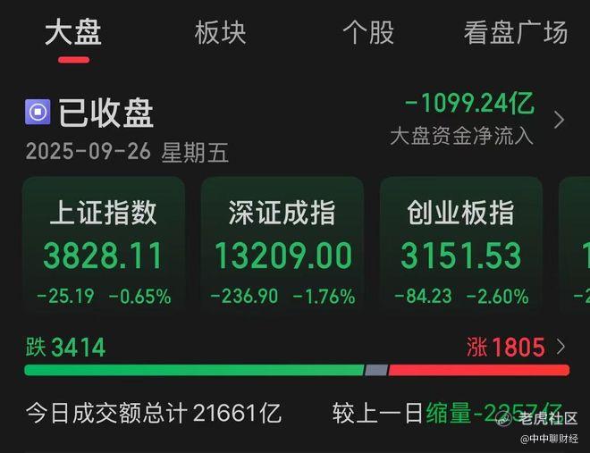 $上证指数(000001.SH)$ 今日A股市场整体呈现弱势震荡格局,三大指数集体收跌,创业板指领跌逾2.6%,深成指跌幅超1.7%,上证指数亦下跌0.65%。北证50同步下挫1.81%。两市成交额回落至2.17万亿元,较前一交易日明显缩量,市场情绪趋于谨慎,超3400只个股下跌,反映出当前资金避险意愿增强。