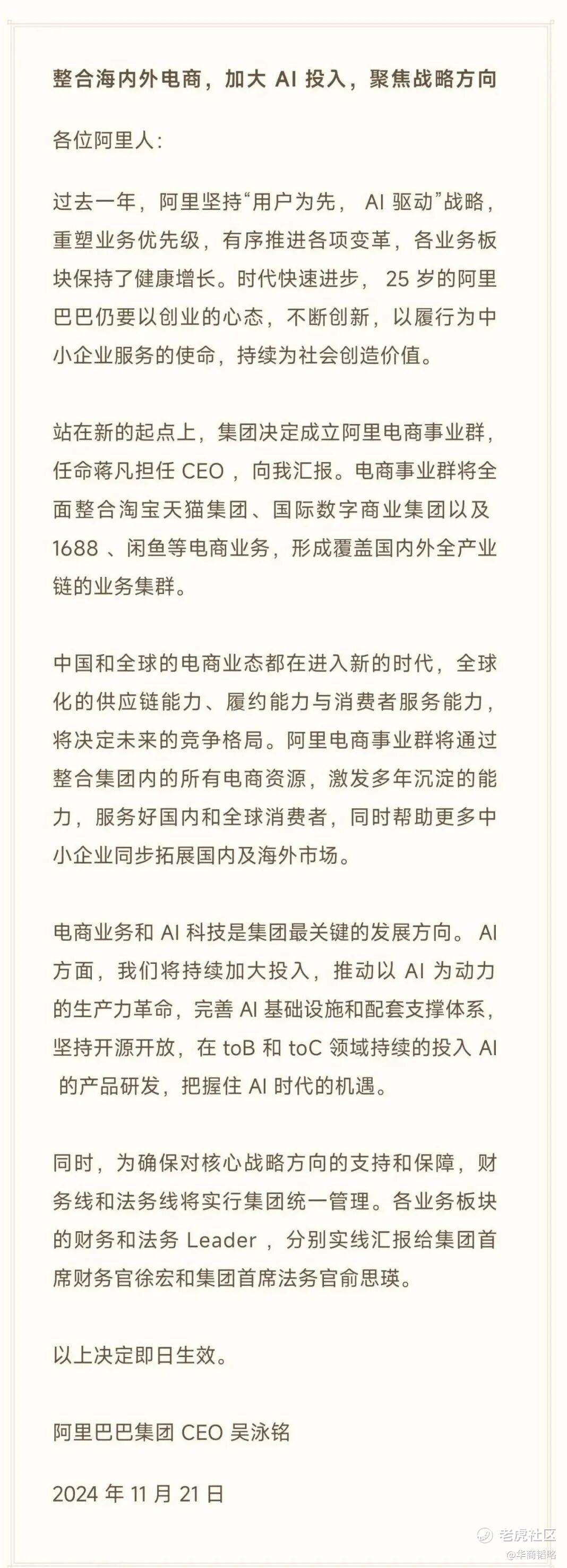 上任后的第一封全员信,他一边强调必须要有再次创业的决心,也一边铆劲—— “只要我们以创业心态,不沉溺过去,不墨守陈规,阿里将在AI时代继续获得巨大发展”。