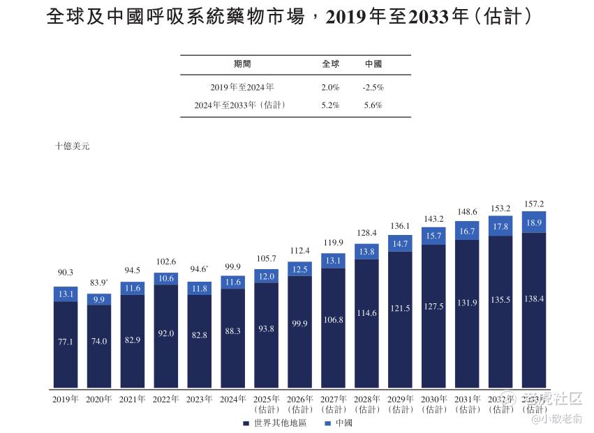 2024年,呼吸系统疾病占全球医药市场约6.5%。由于患病率高、人口老龄化以及环境污染物接触增加,2024年,全球呼吸系统药物市场规模估值为999亿美元(约人民币7,292亿元),预计到2033年将达到1,572亿美元(约人民币11,474亿元),年复合增长率为5.2%,而2024年中国呼吸系统药物市场规模达到人民币831亿元,预计2033年将达到人民币1,355亿元,2024年至2028年及2028年至2033年的年复合增长率分别为4.5%及6.5%。