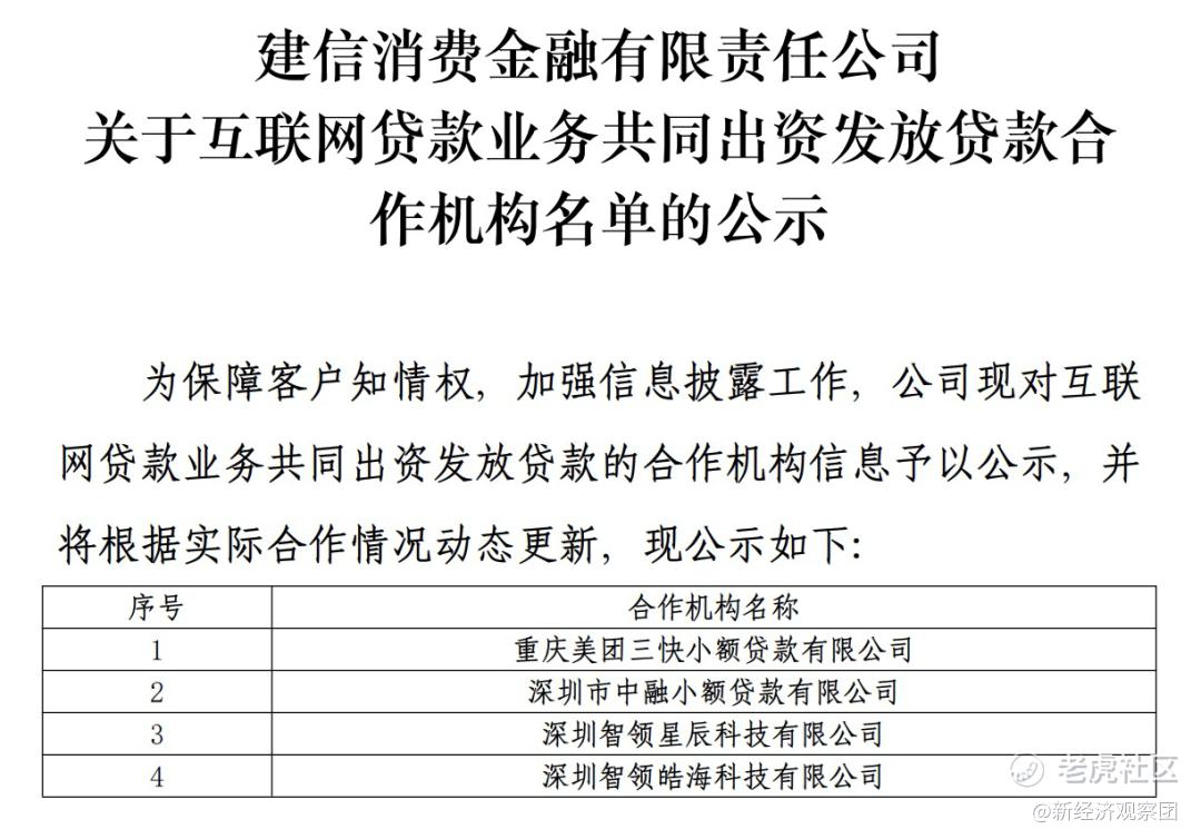 建信消金披露公布的互联网贷款业务共同出资发放贷款(即联合贷)合作机构名单显示,合作方有4家公司:重庆美团三快小额贷款有限公司、深圳市中融小额贷款有限公司、深圳智领星辰科技有限公司、深圳智领皓海科技有限公司,其中后三家均隶属字节。