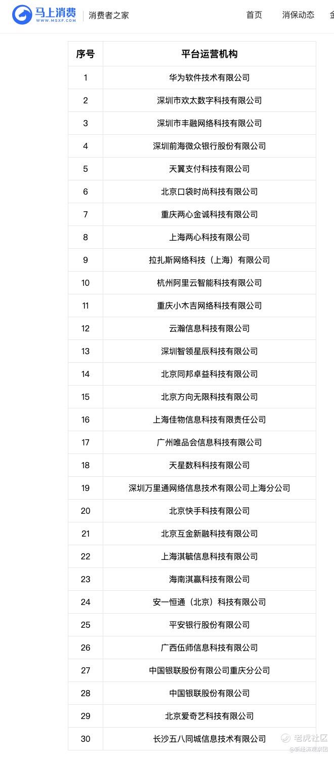 其中,30家平台运营机构主要为头部互联网公司旗下平台,还包括深圳市欢太数字科技有限公司(即欢太数科)、深圳市丰融网络科技有限公司(即vivo钱包)。