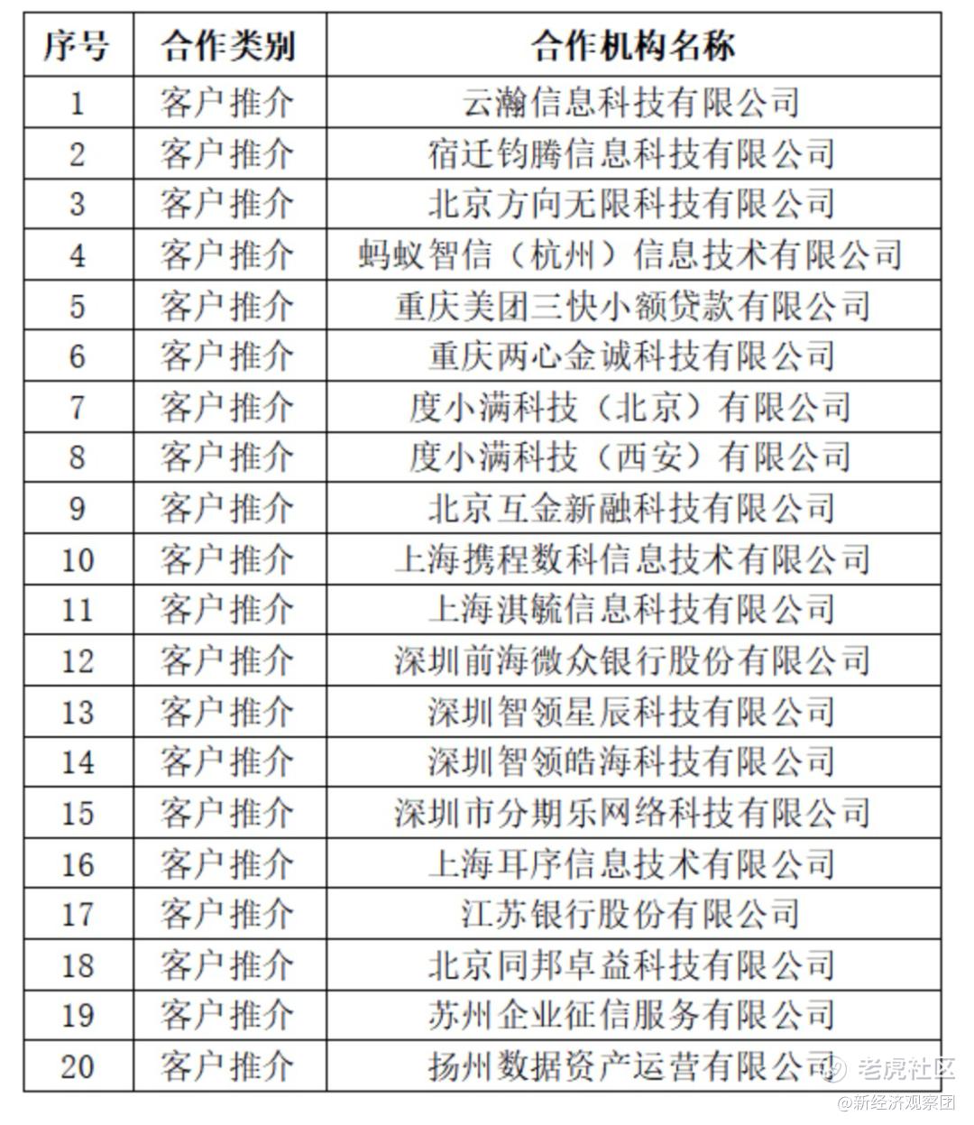 其中,客户推介机构主要是京东、蚂蚁、美团、度小满等头部公司,以及信也科技、分期乐等上市系助贷公司,还有苏州企业征信、扬州数据等地方征信机构。