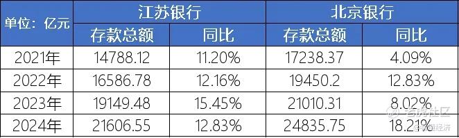 在贷款规模方面,江苏银行也以2.43万亿元的规模领先北京银行近400亿元;尽管在存款总额上,江苏银行仍略低于北京银行约1000亿元,但江苏银行近几年的存款增速也一直保持双位数增长。