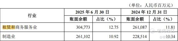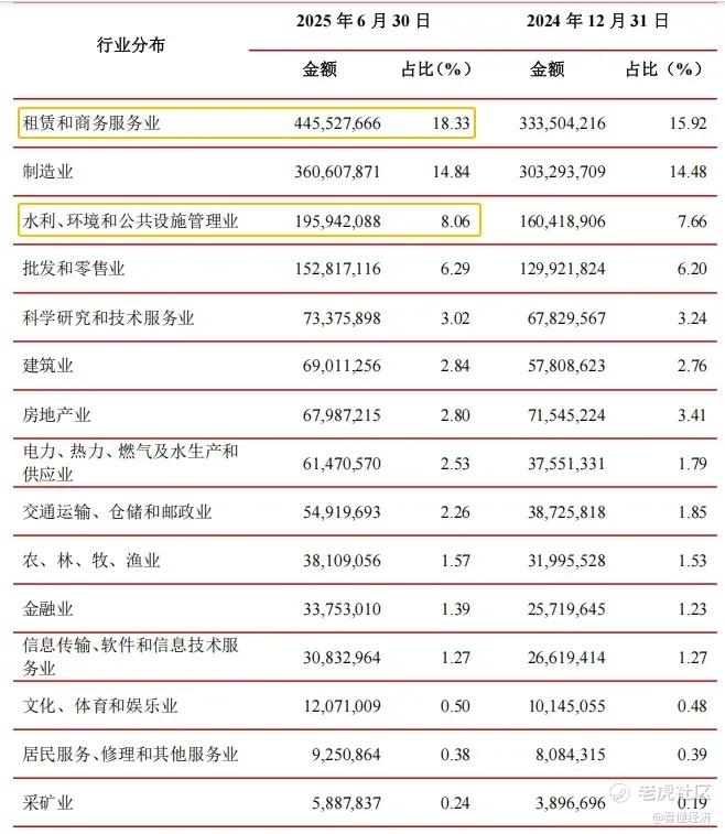 以2025年中期数据为例,江苏银行资产总额同比增速高达26.99%,远超行业平均水平。细观其增长来源,对公贷款中的政信类业务成为重要拉动力量——贷款增速排名前三中的两项,“租赁和商务服务业”与“水利、环境和公共设施管理业”合计占总资产比例达26.39%。其中,“租赁和商务服务业”贷款同比增长36.75%,显示出其在政府相关业务上的强劲扩张能力。