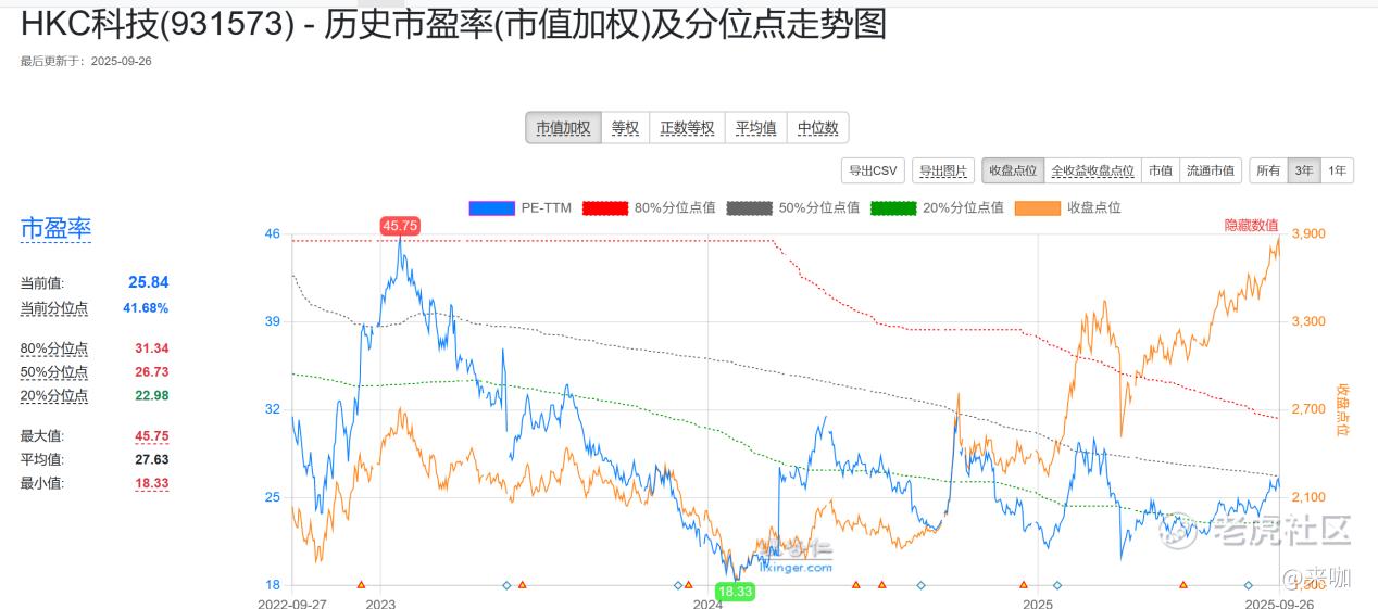 截至上一个交易日(9月26日),HKC科技市盈率为25.84,当前分位点为41.68%,仅相当于2023年高点45.75的56%。