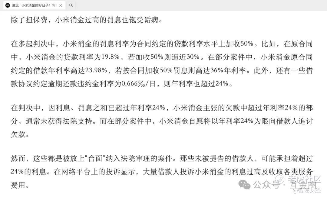 据《网易清流工作室》报道,在部分案件中,小米消金原合同约定的借款年利率23.98%,若按合同加收50%罚息则高达36%年利率。此外,还有一些借款协议约定逾期还款违约金利率为0.666‰/日,则年利率也超过24%。这一低进高出的利差,或许成为其利润增长的重要驱动力。