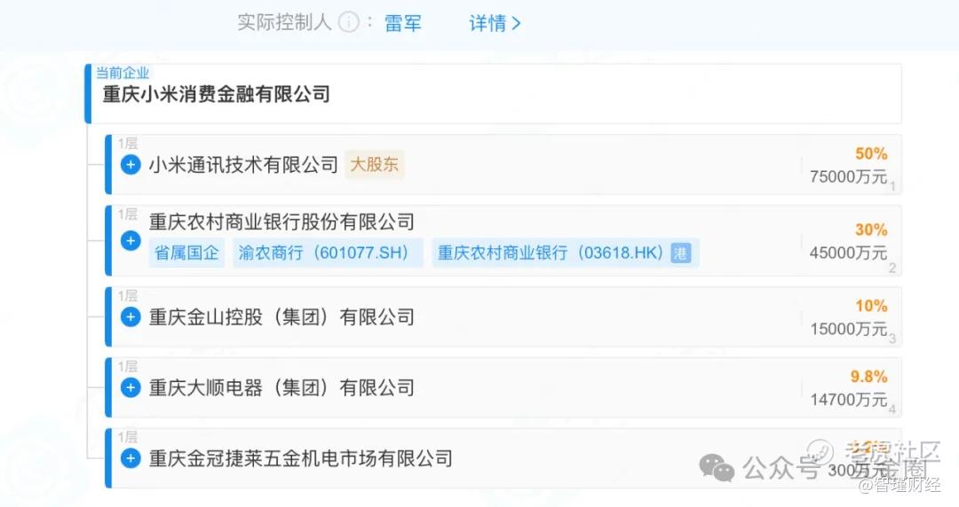 企查查显示:“小米消金”实际控制人为雷军,公司注册资本为15亿元。官网显示:“小米消金”是经中国银保监会批准,由小米集团,联合重庆农村商业银行股份有限公司等4家优质企业共同发起设立的全国性非银行金融机构,于2020年5月29日获开业批复,是全国第26家开业的持牌消费金融公司。