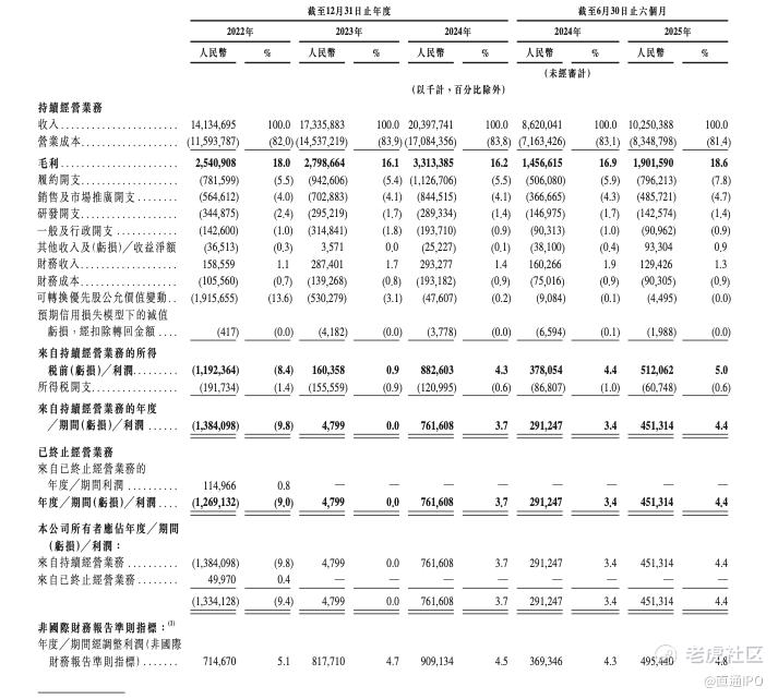 2022-2024年及今年上半年,京东工业持续经营业务的收入分别约141.35亿、173.36亿、203.98亿、102.50亿元;毛利分别约25.41亿、27.99亿、33.13、19.02亿元,毛利率分别为18.0%、16.1%、16.2%、18.6%;来自持续经营业务的净利润分别约-13.84亿、479.9万、7.62亿、4.51亿元,净利润率分别为-9.8%、0、3.7%、4.4%;经调整净利润(非国际财务报告准则指标)分别约7.15亿、8.18亿、9.09亿、4.95亿元,经调整净利润率分别为5.1%、4.7%、4.5%、4.8%。