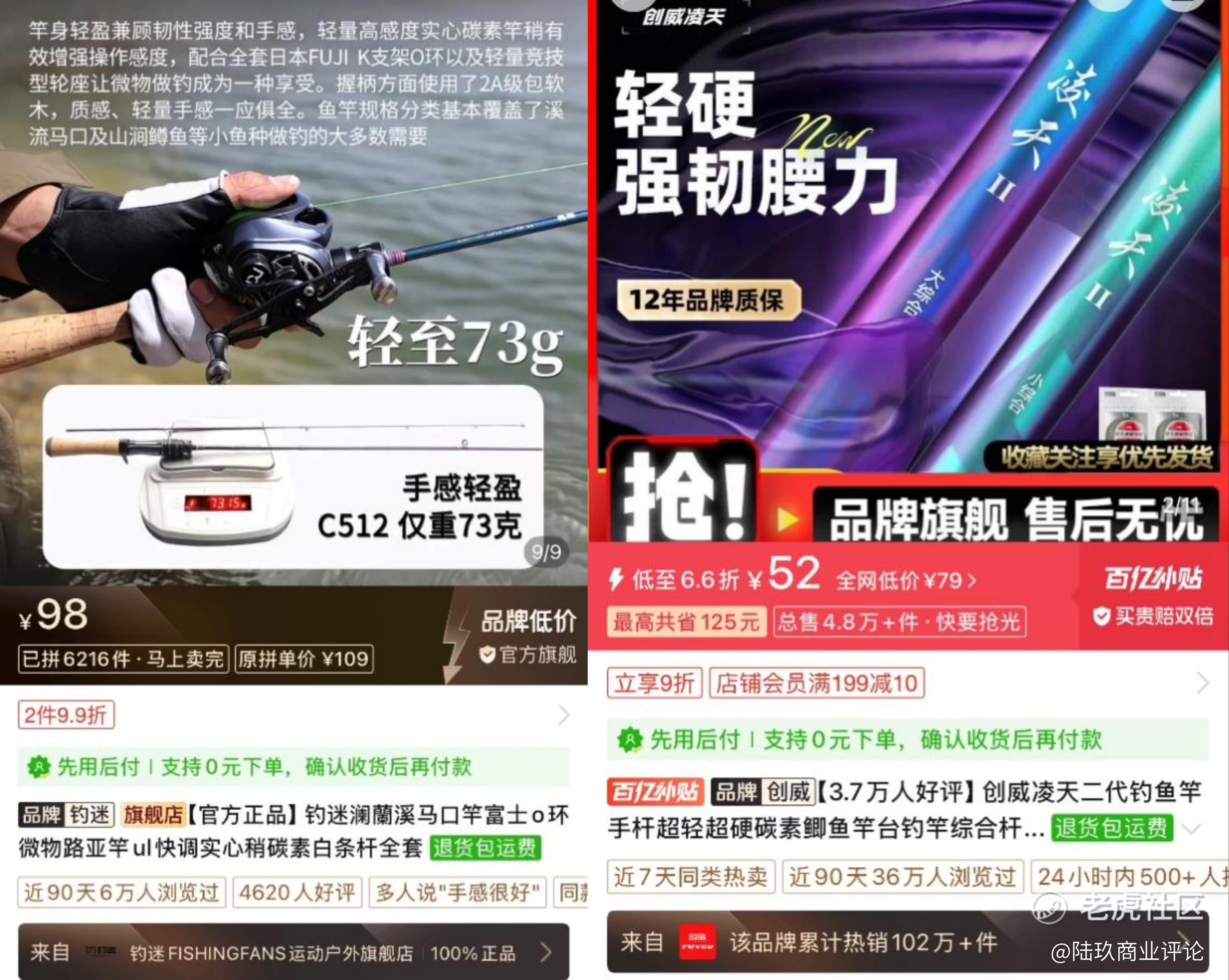 原材料的突破和量产使路亚竿的成本大幅下降。2023年,张荣波在拼多多推出了首款路亚竿,以重99克,100元左右的价格,“成了很多年轻人的第一支路亚竿”。