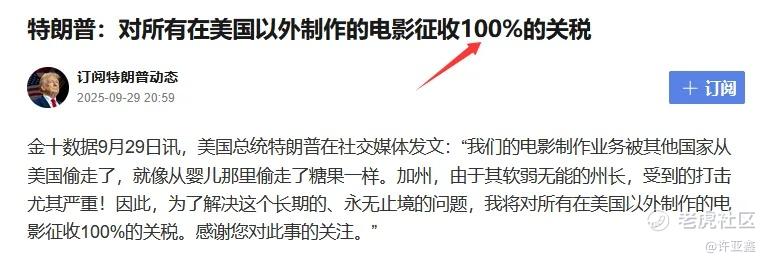 川普发帖表示,对所有在美国以外制作的电影征收100%的关税。华尔街哭没哭我不知道,好莱坞肯定哭了。