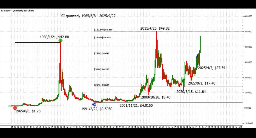↑ 白银季线图关键历史点位:
