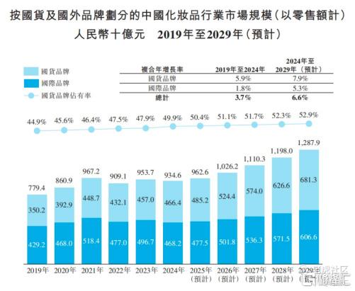 根据弗若斯特沙利文数据,预计2024至2029年中国化妆品行业的市场规模将以6.6%的复合年增长率扩张,约为同期全球化妆品市场增速的2倍,2029年的市场规模将达到约1.29万亿。