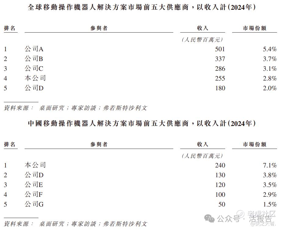 以2024年收入计,公司是全球移动操作机器人解决方案市场第四大参与者,占据2.8%的市场份额。同时公司是中国移动操作机器人解决方案市场最大的参与者,占据7.1%的市场份额。