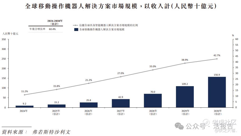 根据弗若斯特沙利文(Frost & Sullivan)的报告,全球移动操作机器人解决方案市场规模在2024年达到人民币92亿元,预计将进一步增长至2030年的人民币1,569亿元,2024年至2030年的年复合增长率达到60.4%。