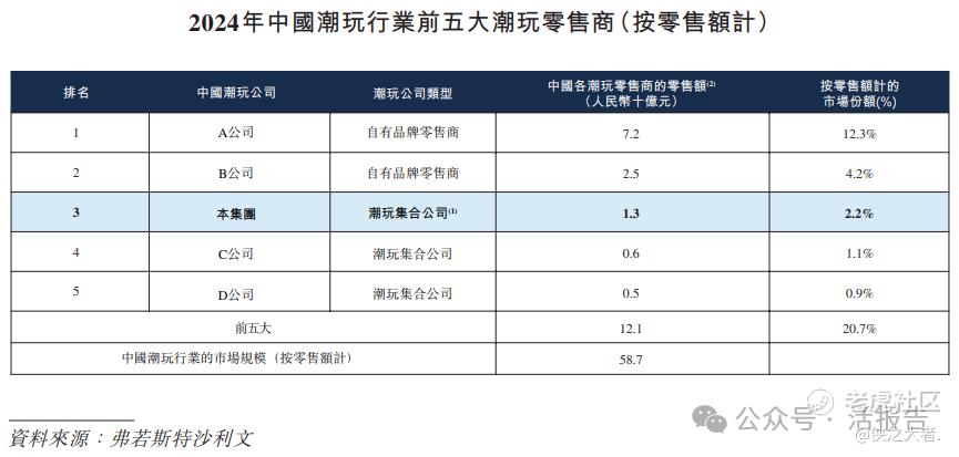 公司2024年在中国的零售额达人民币13亿元,在中国潮玩行业排名第三,市场份额为2.2%。在中国潮玩行业按零售额计的前五大潮玩零售商中,按2020年至2024年复合年增长率计,公司在零售额增幅及门店数量增幅方面均位居中国首位。